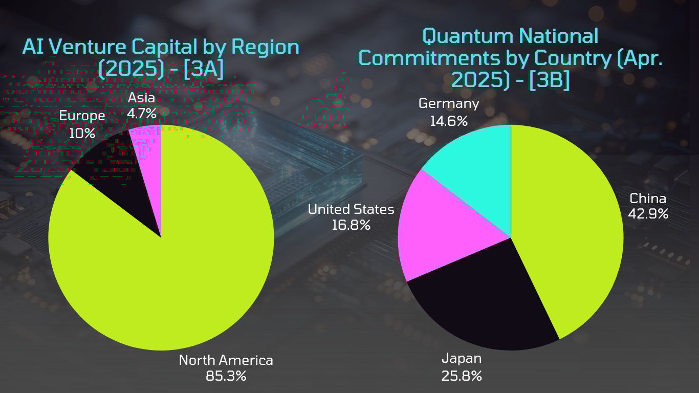 Picture 3A: AI Venture Capital by Region (2025). Private capital in AI remains overwhelmingly concentrated in North America, with Europe and Asia still materially behind in share terms. Source: [8]